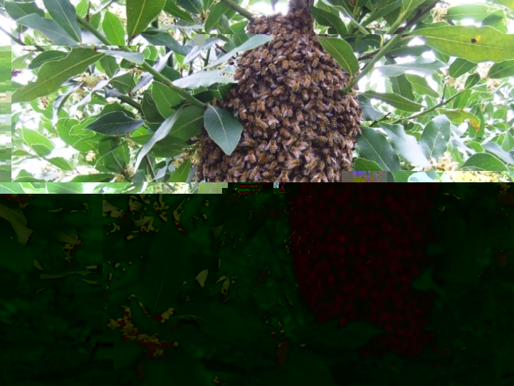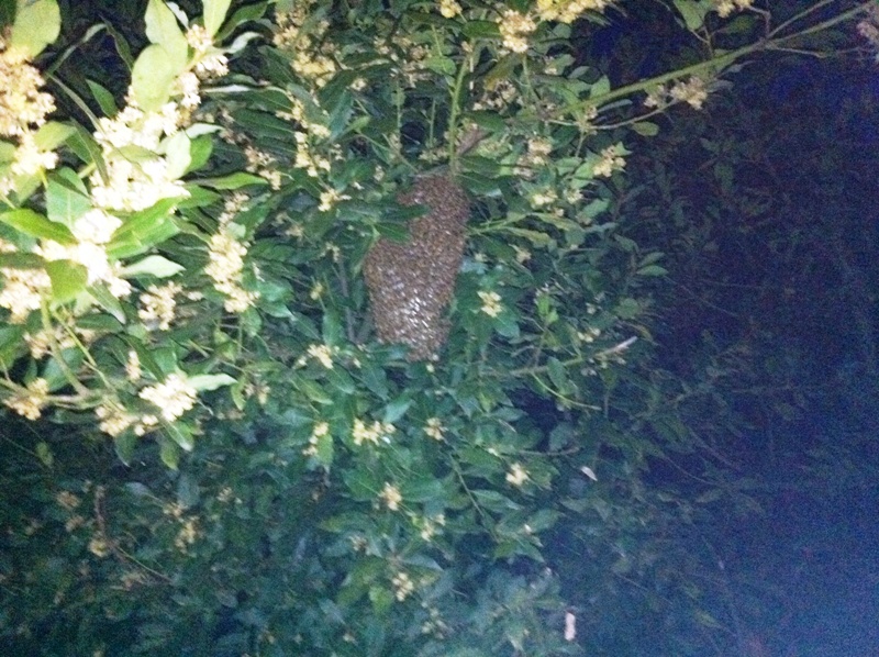 Allora, all'inizio è stato tutto semplice: mi avvicino, vedo che contrariamente a quanto mi sembrava ieri sera sono in realtà al 90% su un solo ramo e quindi, dopo aver sfoltito un po' di rametti taglio quello in questione. Nel portasciami avevo messo un telaino per parte, ci posiziono sopra lo sciame e con un paio di colpi entrano quasi tutte all'interno. Prima di inserire gli altri telaini, mentre recupero forbici, affumicatore(non usato) e cellulare per fare un paio di foto ecco che in cima ad un telaio vedo tutta sola soletta la regina. Non sapendo che fare ci penso un attimo (e nel frattempo scatto le due foto che vedete).
