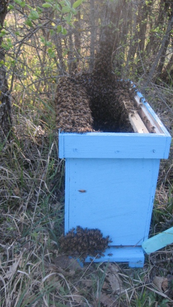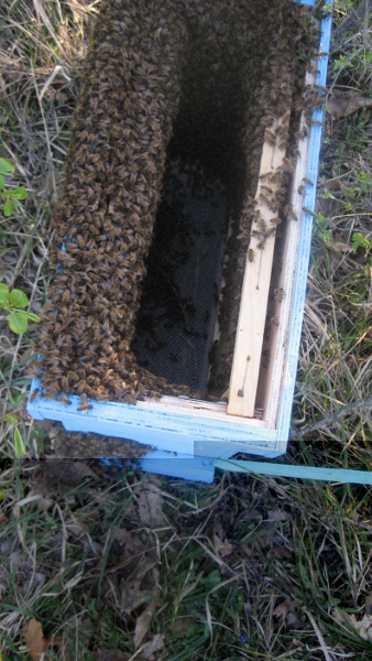 è sempre sull'albero , con un pò di fumo cerca di riunire le api e procedi sempre nello stesso modo. Alla fine Le api che stanno sui bordi ,con la spazzola delicatamente le fai cadere spingendole nella cassa ,nella quale avrai messo senz'altro alcuni telai ,quindi chiudi con il coperchio , accertandoti che l'entrata in basso sia libera , dopo un'oretta prendi il tutto e lo porti a casa .