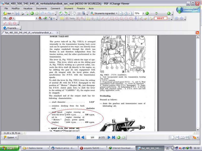 si fiat dischiara i pesi con trattore completamente rifornito, con telaio di sicurezza (o cabina) e senza zavorre. Parlo senza dati precisi ma per esperienza, secondo me per fare 540 giri alla pto il 640 lo devi accellerare molto di piu del manuale (tarocco) che hai trovato, ma forse qualcuno ci puo confermare questi dati, aspettiamo e vediamo se è un tarocco ho meno. i dati sono ufficiali fiat, in + ti allego anche il manuale officina ufficiale fiat e sono gli stessi. la velocità di rotazione della pto la puoi misurare solo applicando all'albero una ruota fonica e sensore induttivo opp effetto hall. con la fresa o altro devi trovare sempre il giusto accoppiamento in quanto i rapporti della fresa sono intercambiabili e di conseguenza vari la velocità del rotore e comunque non puoi superare i 355rpm (fresa howard rotavator hr30) che sono il max raggiungibile con le zappatte. 400rpm con i coltelli. es: i db che hanno i giri veloci alla pto bisogna mettere rapporti lenti alla fresa, viceversa i fiat che hanno i giri +lenti alla pto devi mettere i rapporti veloci alla fresa e di conseguenza avrai sempre 355rpm al rotore con gli stessi rpm motore.