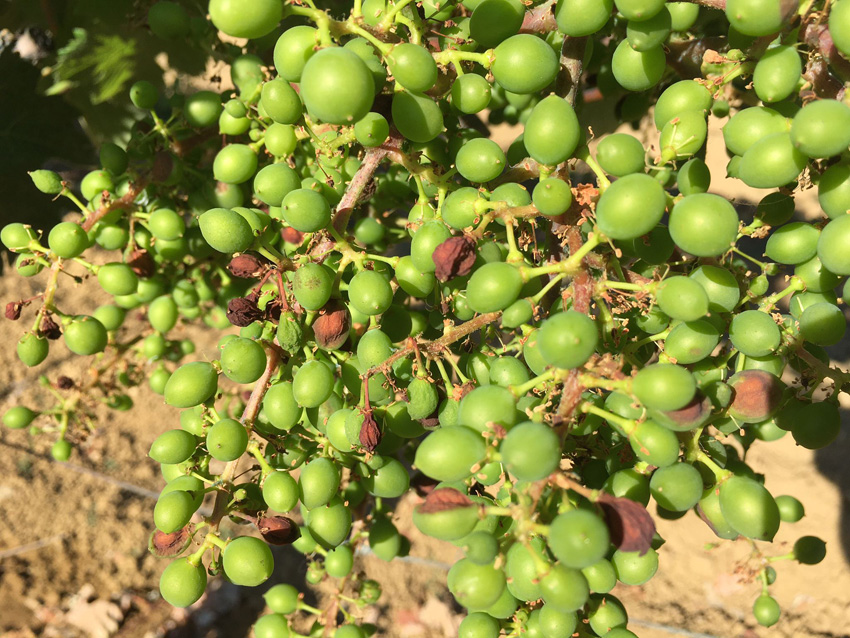 Il problema si verifica prevalentemente su vite di canaiola e zibibbo, ma anche -in minor parte- su Vittoria e Italia. La parte interna del grappolo, dove c'è più ombra è colpita di meno. Da tenere presente che l'ultima pioggia è stata in pre fioritura, dopodiché clima sempre secco e ventoso. L'irrigazione viene fatta a terra. Sapete dirmi qualcosa? Grazie!!!