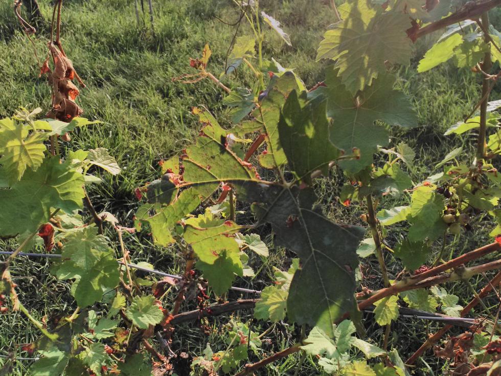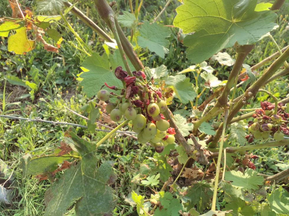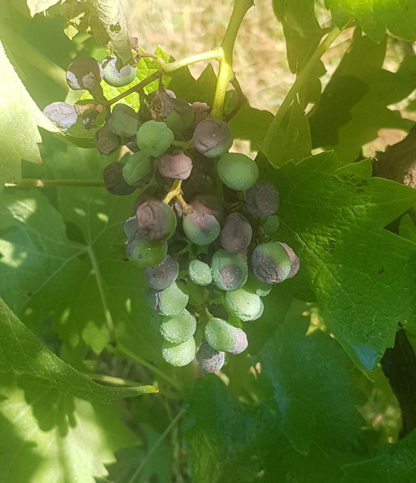Ho queste viti di varietà resistenti, cabernet cortis, cabernet prior, gold muscat, nerona varietà antica, ci sono queste situazioni nei grappoli con acini scuriti e seccati, quest'anno ha piovuto pochissimo, come è possibile una crittogama in condizioni così asciutte e su varietà resistenti? cosa pensate che sia? e quale rimedio adottare