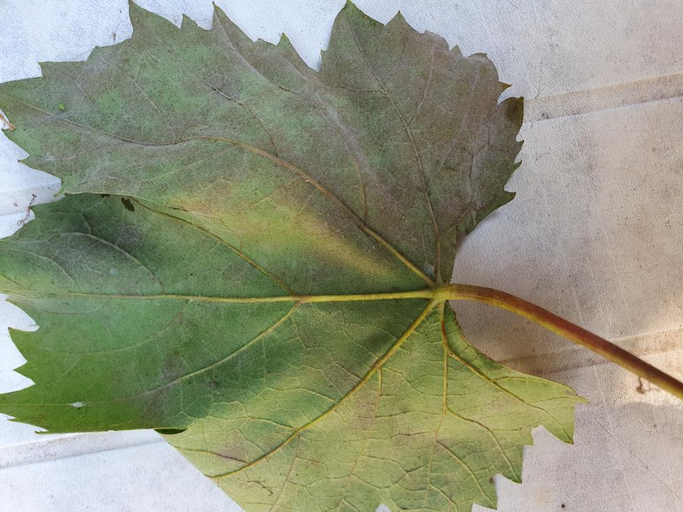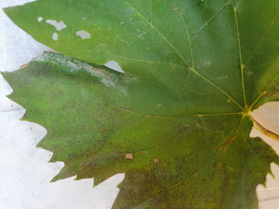 Buon Ferragosto a tutti! Ho una pergola di uva da tavola su cui è caduta una pioggia leggerissima di qualche minuto che sembrava del tutto assorbita in poco tempo, questo 6 giorni fa in Sardegna, dove mediamente siamo oltre i 30°. Oggi ho fotografato qualche foglia della vite e in una vedo la larva di un parassita che non conosco, nelle alte una imbrunescenza che vorrei identificare. Non ci sono le macchie d'olio tipiche della peronospora. Cosa ne pensate?