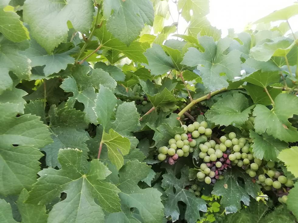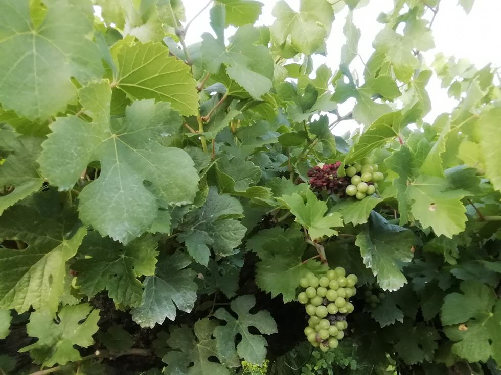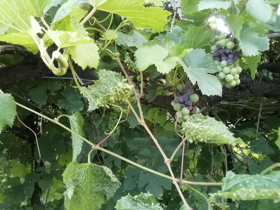Devi solo stare attento a fermare l'infezione se è in atto. Userei un dimetomorph o, meglio (ma costa tantissimo) uno zorvech (da usare non più di diue volte al anno). Sempre con copertura. Però non so se sei nei tempi di carenza per la raccolta del uva. Nel caso rame (200 gr a ettolitro di rame metallo puro brucia qualsiasi spora) ma occhio a non fare danni sulla vite, va sparso bene senza gocciolamenti. In sostanza brucia. Invece attento non parta botrite sugli acini "morti". Tieni arieggiato, defoglia un po'. Nel caso un antibotritico solo sul grappolo.