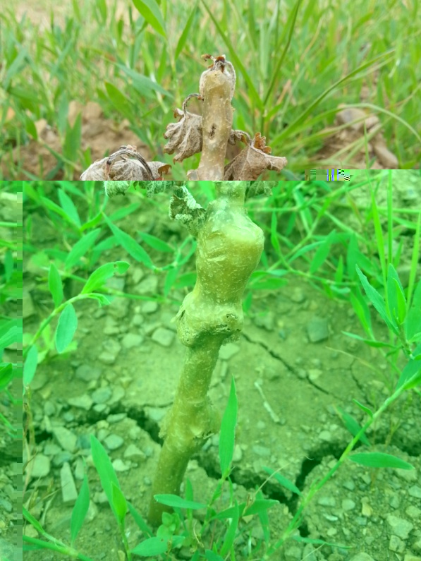 Libellula mi ha preceduto. Però aggiungo: 1) quell' infestante non è la sola pianta che cresce in terreni siccitosi; 2) due settimane senza acqua bastano e avanzano per disseccare una barbatella piantata nell'anno, tanto più che è stata sistemata, come già detto anche nel mio post precedente, con le radici troppo superficiali, mentre è l'innesto che deve stare a fil di terra Saluti Pedru