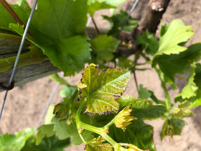 Salve a tutti. Questa mattina in vigna ho notato che una gran quantità di foglie piccole (molto meno quelle più grandi) ha il bordo annerito come nelle foto allegate, come se fossero bruciate.