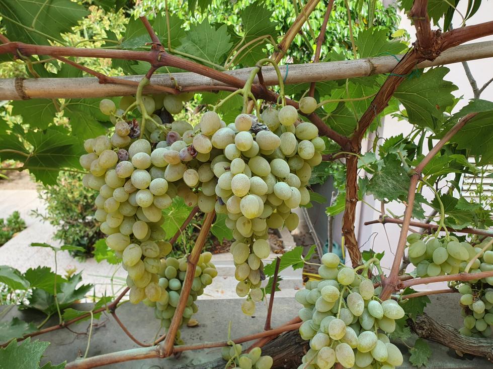 Ho una spalliera di uva (?) nota come francese, esposta a mezzogiorno ad Oristano. è una varietà che regge gli attacchi dell'oidio e della peronospora ma alle prime piogge viene falcidiata dalla botrite. Ho pensato, essendo a ridosso di un muretto, di darle più aria sfoltendola e somministrando soprattutto sui grappoli zolfo ramato in polvere, trattamento che ho fatto anche in primavera(2volte). Ora i grappoli sono ancora belli, come da foto, ma ci sono i primi segnali di botrite. La dose massiccia di zolfo ramato può essere utile per bloccare l'infezione? è vero che se si esagera con lo zolfo ramato rimangono tracce nel grappolo anche per molto tempo e può nuocere alla salute? Vi posto qualche foto. Grazie e buon fine ferragosto