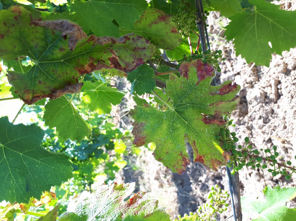 Se non è acaro rosso , ed è carenza di potassio,più avanti vai nella stagione con potassio carenza le foglie basali più vecchie diventano marrone scuro,in particolare quelle vicino ai grappoli.