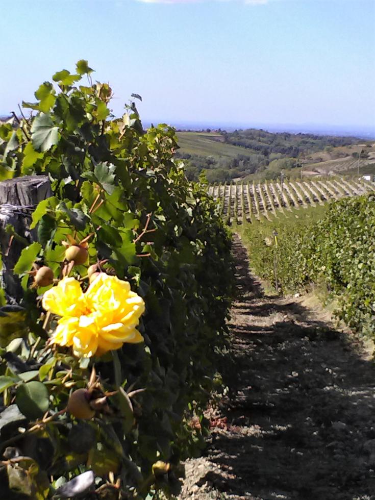 Meno male che per la vite si sono anche informazioni in italiano (per inciso il filare della mia foto è di vitigno cortese, uva bianca, ecco allora spiegata la rosa gialla) Le rose nelle vigne Capita spesso di vedere delle rose in testa ai filari dei vigneti. Sono un omaggio alla tradizione che utilizzava questi fiori come campanello di allarme per segnalare l’arrivo del temutissimo mal bianco. Questo parassita, infatti, attacca prima le rose e poi, dopo circa una settimana, la vite e consente ai viticoltori di intervenire in tempo con gli anticrittogamici. Oggi si utilizzano sistemi scientifici di analisi e previsioni della diffusione dei parassiti, ma le rose sono rimaste, anzi si stanno diffondendo ulteriormente: rose gialle per i filari di uva bianca e rose rosse per quelli di uva nera. Oggi per le uve più importanti sono state create delle varietà specifiche di rose che portano il nome dei vitigni ai quali sono dedicate.