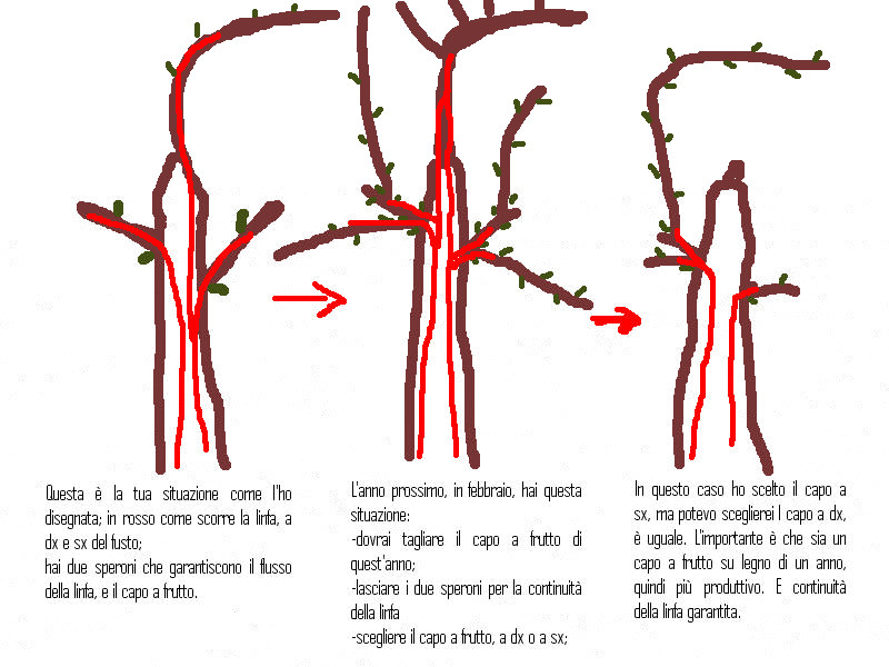 riguardo alla penultima foto o comunque alla modifica di dkrag non mi sembra molto fattibile perchè il ramo che devi raddrizzare è gia bello grosso.Inoltre se vuoi provare con quella alternativa il raddrizzamento va fatto nel tempo.Altrimenti crei una strozzatura è il passaggio della linfa si riduce o si strozza proprio!! Almeno dalla foto mi sembra un pò tosta raddrizzare un tralcio cosi grosso(sembra di circa 4 anni).