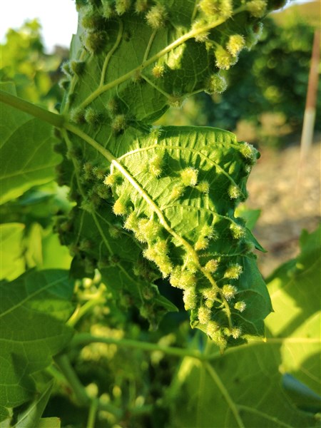 Confermo il sospetto di fillossera su pianta innestata, e allego foto. Si notano le galle nella lamina inferiore della foglia a differenza dell erinosi che va verso la pagina superiore