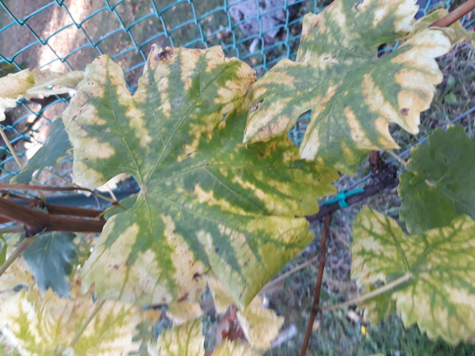 Devi porre attnzione e farle vedere ad un esperto, la prima foto potrebbe essere mal d'esca o danni da cicaline, ma sembra più la prima. La seconda foto è magnesiocarenza, almeno sembrerebbe. Hai concimato con microelementi in questi ultimi anni? Aspetta altri pareri.