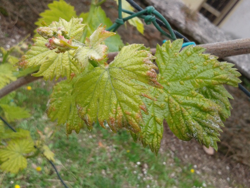 Qualche galla di erinosi sembra che ce l'hai ma non è preoccupante, più che altro quella roba bianca che si vede sui bordi che cos'è? Muffetta da oidio?
