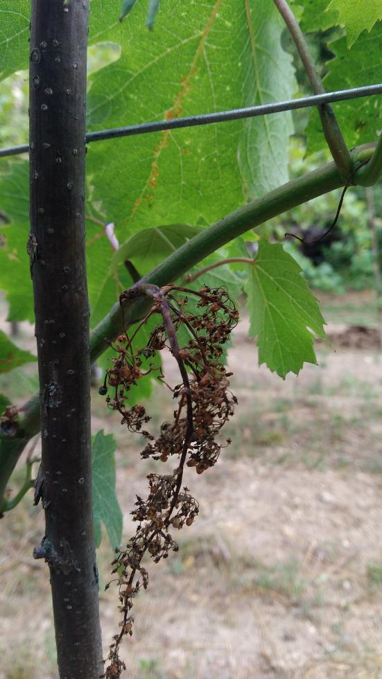 Quella fogliolina disseccata è botrite e con quella bisogna conviverci purtroppo, mentre il grappolo escludo un attacco di botrite anzitutto per il colore che sarebbe dovuto essere grigio cenere o biancastro invece è proprio secco stecchito e poi come si può notare la foglia non ha macchie da oidio, vedo anzi macchie da trattamento il che mi fa pensare che quando tratti non nebulizzi abbastanza e la foglia viene macchiata dal prodotto che utilizzi, questo problema non permettere di avere una copertura azione sicura, un buon trattamento è ben riuscito quando non trovi alcuna traccia sulla vegetazione.