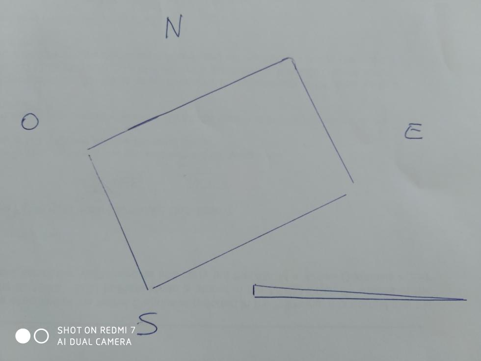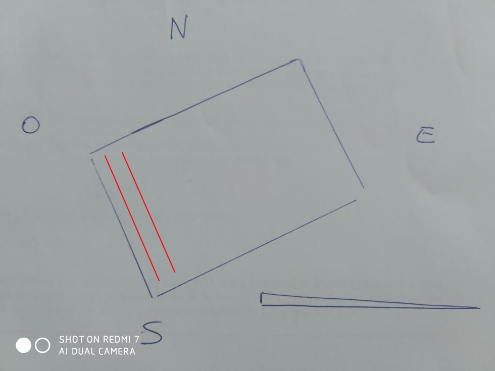 - l'orientamento dei filari ideale è tipicamente da nord a sud così che la parete fogliare prende il sole da un lato quando sorge e dall'altro quando tramonta, considerato che la pendenza è leggera problemi non ne avresti; più che altro per come è girato l'appezzamento a tenere strettamente un orientamento nord-sud ti obbligherebbe a fare filari più corti nell'angolo a ovest, quindi io probabilmente farei come in figura che non mi sembra che l'orientazione cambi poi di molto rispetto al nord-sud: