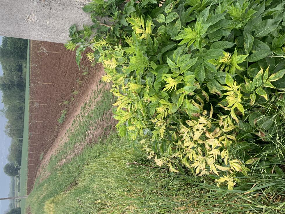 Il vicino, quello del campo sopra il rialzo con l’erba che si vede nella foto, mi dice che non ha ancora dato il diserbo al mais. Se fosse diserbo, dovrebbe essere volato per più di 39 metri partendo da un livello 1,5 m più alto. C’è chi mi ha detto che potrebbe essere carenza di ferro o potassio. 10 filari di groppello sono tutti così. Dall’11 ho piantato barbera e quello non ha niente. Grazie