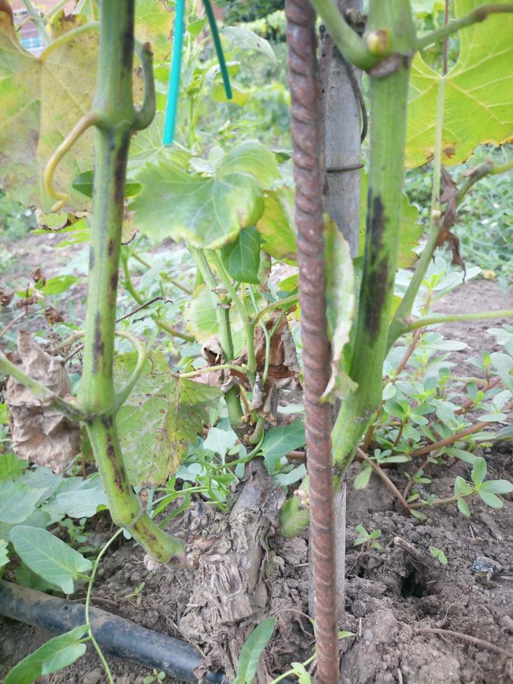 Ok , credo che dovrò anche comprarmi un bel pluviometro ! Comunque per completezza ti allego anche qualche immagine del fusto in formazione ; Queste sono quelle che stanno messe " peggio" ma ho qualche dubbio che possa trattarsi di escoriosi anzichè peronospera ( che invece è evidente sulle foglie )... ; Sono del tutto compromesse ? prossimo inverno conviene ripotare a due gemme ?