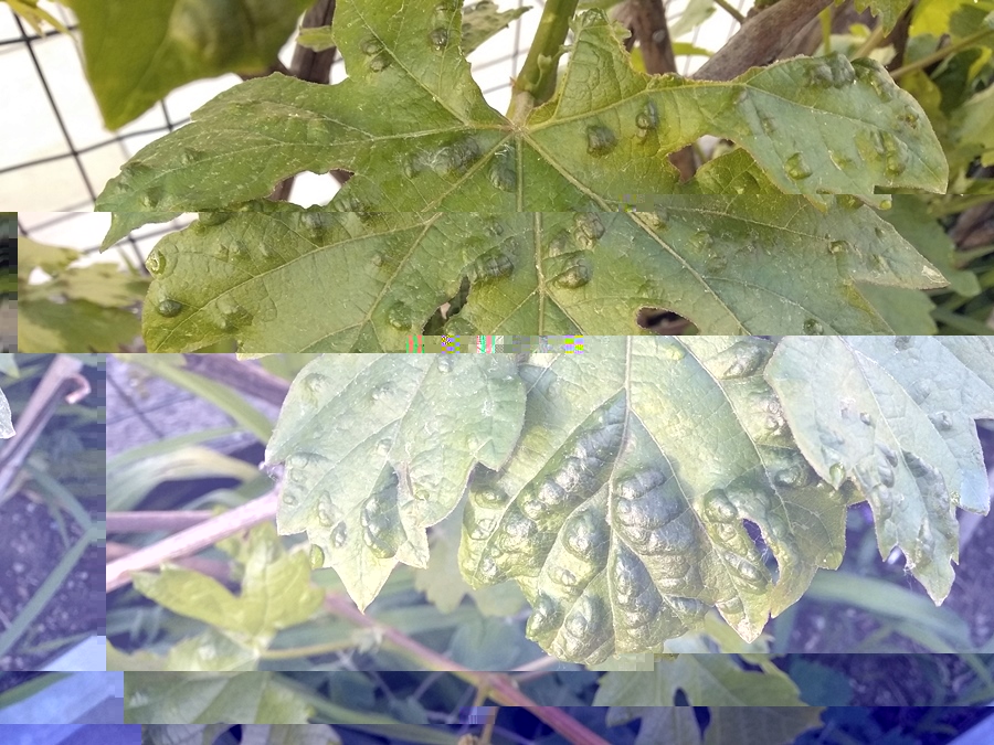 Senza dubbio è erinosi, come immaginavo dalla distribuzione delle chiazze. Ho esaminato giusto ieri una foglia per vedere se riuscivo a osservare l'eriofide responsabile che si chiama Colomerus vitis ma è molto piccolo e semitrasparente (ti posso solo far vedere il feltro close-up) e insinuato nel tessuto fogliare che punge per procurarsi nutrimento: per reazione la foglia emette peli che formano come un ammasso feltroso da cui il nome dato all'avversità. Si tratta di un parassita secondario e raramente può causare danni significativi.