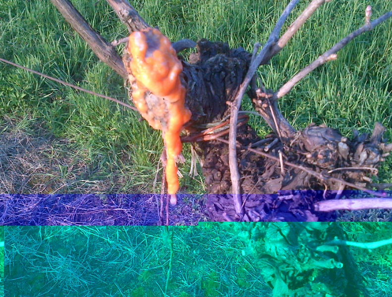 In allegato foto di ceppo di vite, ho notato un pianto abbondante e continuo di colore arancione. Mi confermate essere innocuo? è dovuto a stress? carenze alimentari? c'è qualche rimedio?