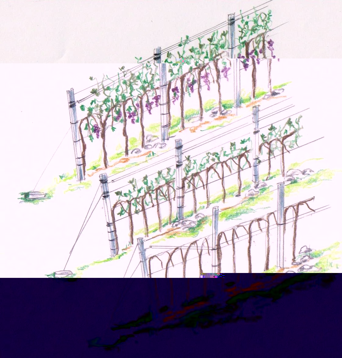 dipende dalla distanza tra le piante. se superiore al metro, devi impostare un cordone permanente. poi, dai germogli che sviluppano da questo, deriveranno i tralci di 7-12 gemme che imposterai tutti gli anni, curvandoli in giù, a distanza di circa 50 cm l'uno dall'altro, come si vede nel disegno. ovviamente, più le piante sono rade, più tralci devi curvare. poi, tutti gli inverni, li tagli e ne curvi di nuovi per la produzione dell'anno successivo