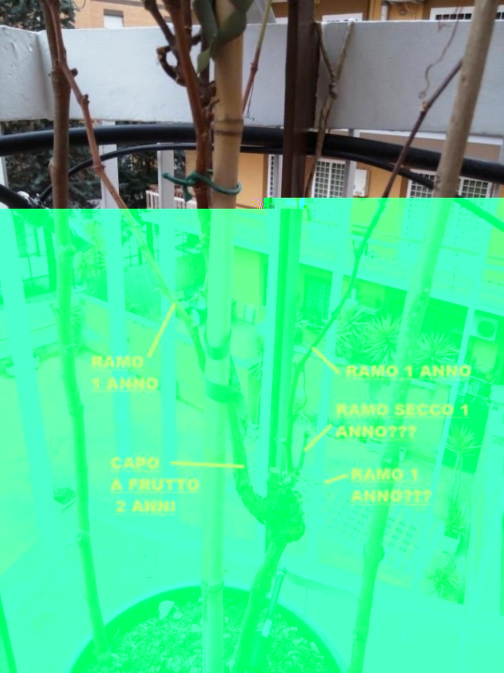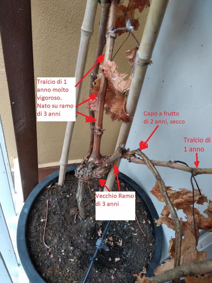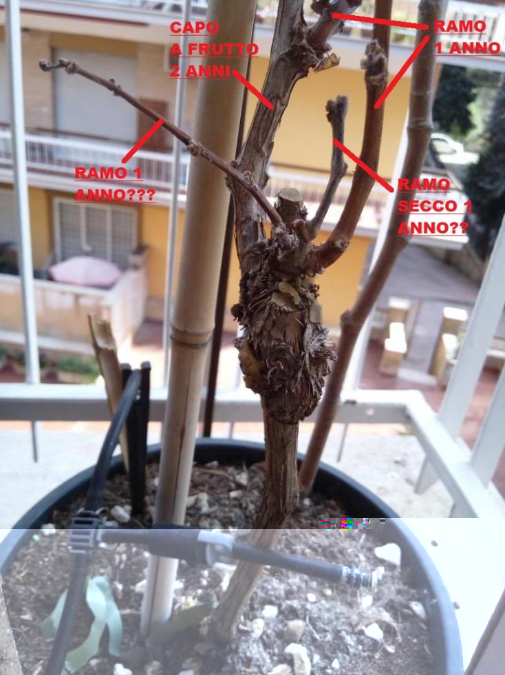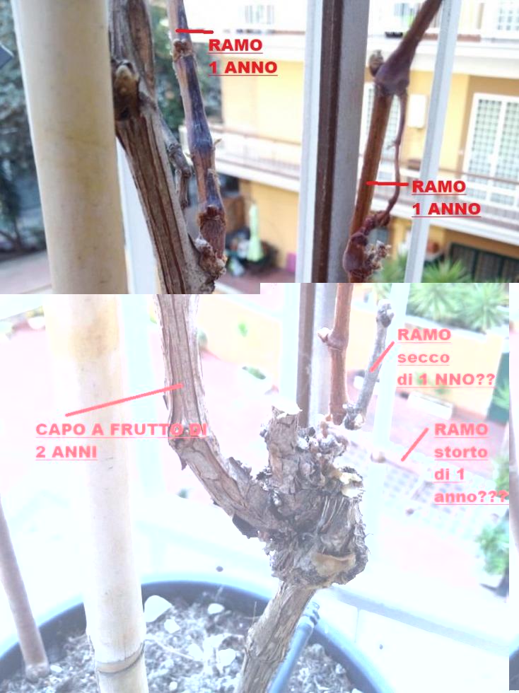 Ciao a tutti. Vi chiedo aiuto su come potare una vite che ho in un vaso sul balcone (a Roma). Ho fatto 2 foto, e ho indicato con delle scritte il tipo di rami che mi sembra di riconoscere. Da quello che ho capito, devo: tagliare il vecchio capo a frutto di 2 anni, selezionare il nuovo CAPO a FRUTTO tra i rami di 1 anno, creare uno SPERONE tra i rami di 1 anno. Quali rami tra quelli in foto mi consigliate di usare?