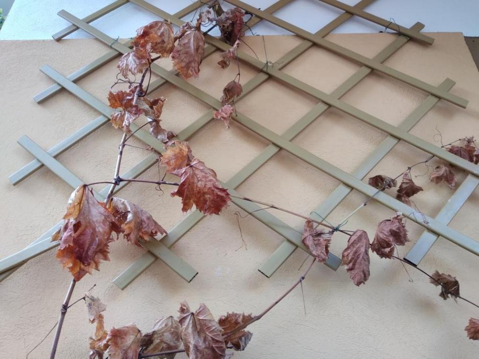 La pianta non ha dato frutti, ma è stata abbastanza vigorosa. Sono spuntati 2 tralci, di cui uno molto vigoroso si è arrampicato fino alla griglia della terza foto.