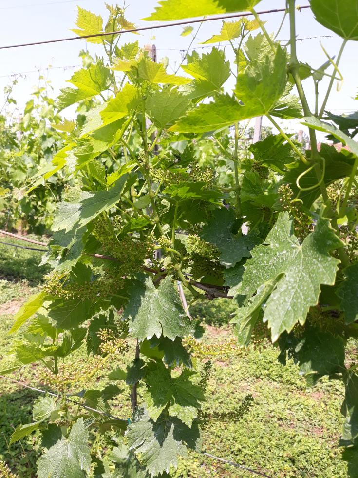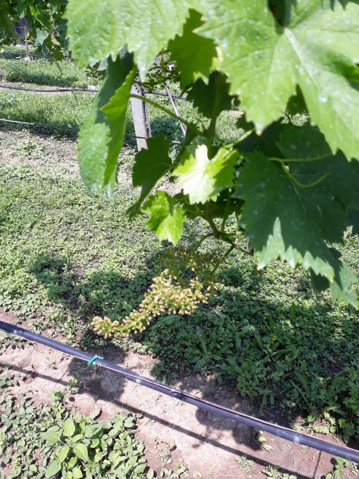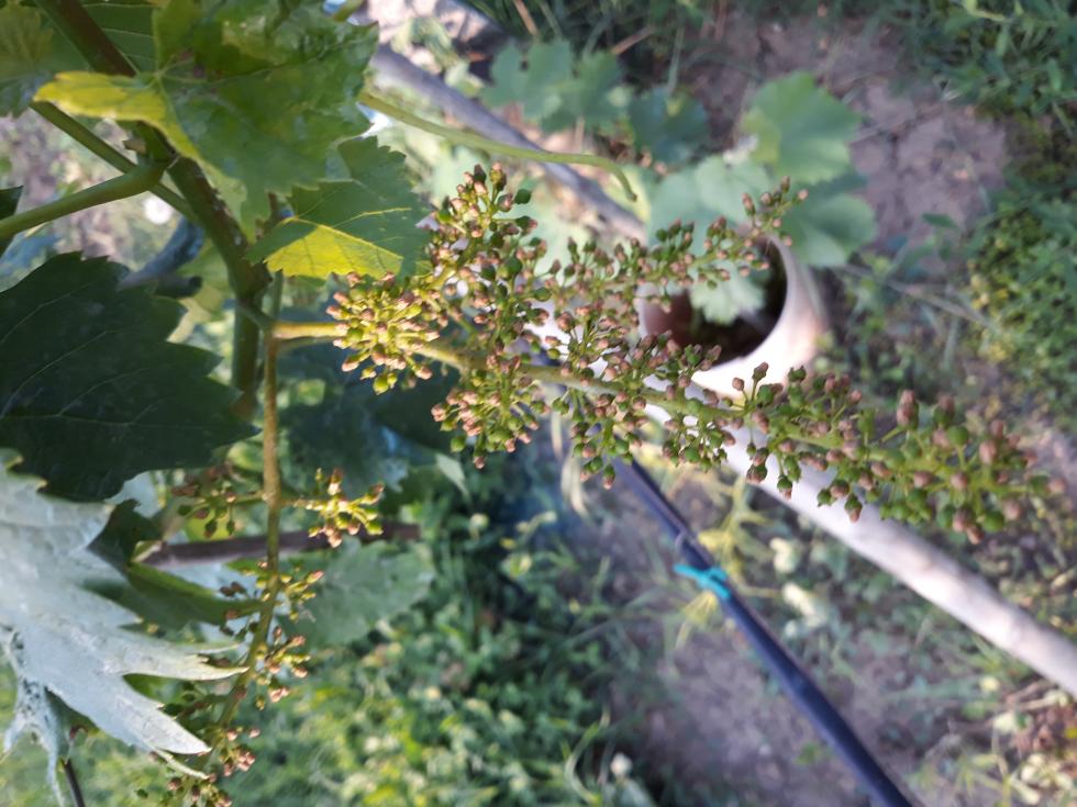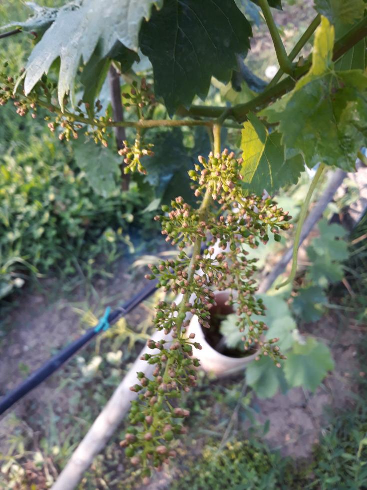 Allego un'altra foto col grappolo in primo piano, volevo capire se quei puntini rossi è solo l'effetto della fioritura oppure è una malattia che porta a seccare il grappolo, ho provato a strofinarlo con la mano, si tolgono come fossero dei petali secchi e sotto rimangono i chicchi piccoli. Però come mai si trovano solo su alcuni?
