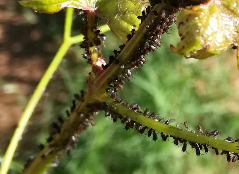 Sarebbe interessante conoscere la specie in quanto su vite è raro trovare infestazione di afidi: ciò in verità sarebbe possibile solo se uno specialista li avesse sotto la lente, tuttavia ti chiederei, se hai voglia, di verificare se sulle vicine zucchine e/o altre piante sia presente, giusto per avere un orientamento.