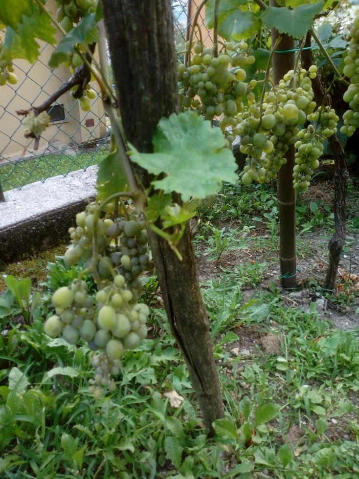 Inizialmente non li ho contati poi ho visto che erano 10. L'ingordigia e l'inesperienza hanno avuto il sopravvento. Mentre s'andava avanti scopro alcuni giorni fà alcuni grappoli affumicati leggermente da una velatura grigia...forse muffa. Non li ho fotografati ma li ho tagliati e gettati. Adesso vedo un ingrigimento generale che quasi non si vede ma, c'é. Posto due foto, una diretta ai grappoli ed una allo stato generale della vite. Le foglie mi sembrano in salute. Il tempo non é stato piovoso. Ho fatto i trattamenti rameici. Ho notato gli acini piccoli che non crescono per i motivi che sono stati detti prima. In definitiva i grappoli adesso non vanno avanti con la maturazione e chiedo cosa possa essere quella specie di fumaggine che ho accennato. Cosa si può fare? Grazie