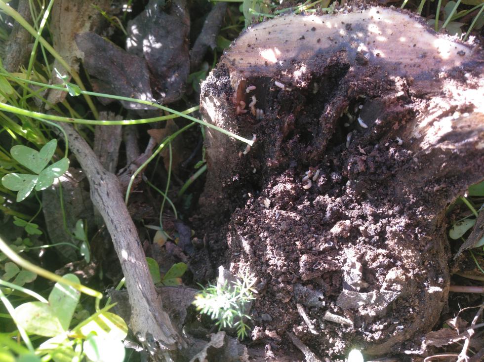 Temo proprio che siano le termiti del legno e che ti toccherà un lavoraccio per estirpare/bruciare il vecchio e reimpiantare. In alcuni siti suggeriscono di impiegare funghi entomopatogeni (M. anisopliae) ma le pubblicazioni in materia sono scarse e non riguardano situazioni come la tua.