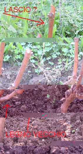 Quindi in pratica la situazione della vite trapiantata è questa: devo lasciare solo un tralcio x allevamento a guyot quale secondo voi? io avrei pensato il centrale, Però cè l altro in basso segnato con la freccia che nasce da legno vecchio dell'anno precedente che ne dite?