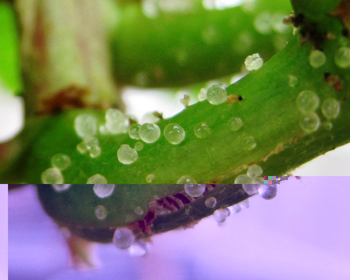 Su assume che biologicamente abbiano una funzione difensiva. Si osservano su piante di 19 famiglie botaniche tra cui ad es. Cissus (vd. foto1) oltre che su vite (vd. foto2). Questa sorta di gocciole in realtà hanno una struttura provenendo da formazioni tissutali glandulose. Attirano in particolare le formiche che così offrono una protezione alla pianta verso insetti fitofagi.