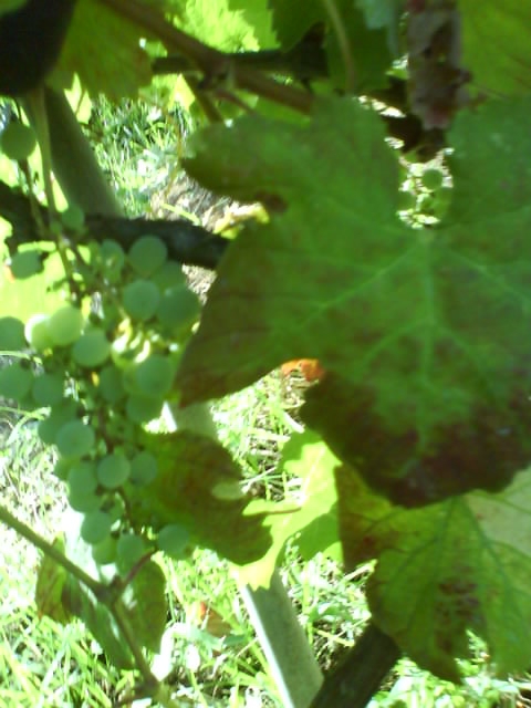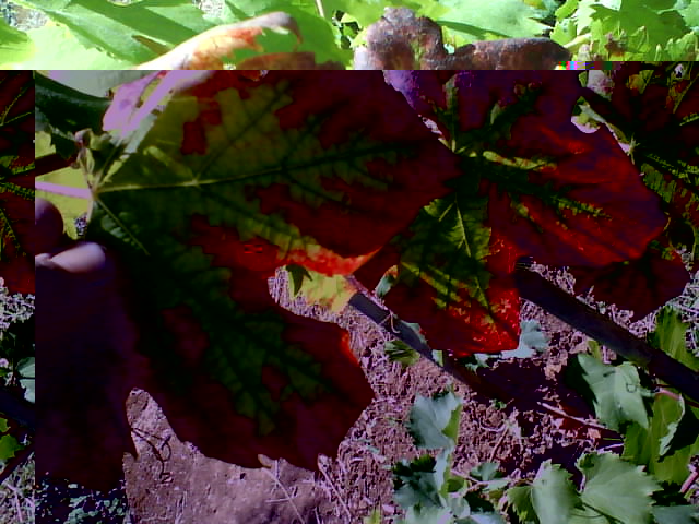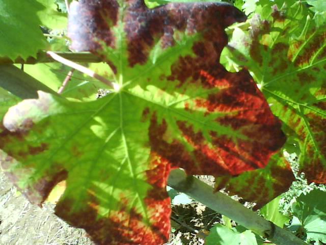 sullo sfondo si nota il cabernet dalle foglie verdi più scure come mi devo regolare? è una situazione pericolosa? per ora non noto altri segni sulla pianta ne su grappoli; qualche altra foglia colorata di rosso la intravedo solo su piante di cabernet; forse è una sua caratteristica.