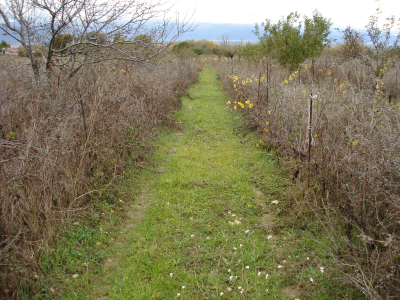 Nella foto “da monte a valle” non si puo’ capire gran che, ad ogni modo si vede il passaggio centrale di circa 2,50 m e le file sono distribuite 5 a destra e 5 a sinistra, distanziate di 1,50 m. Il terreno e’ lungo 50 m e largo 15 m. Nella parte sinistra della foto, la piu’ infestata, e’ situata una sorta di risorgiva, tuttavia non individuabile con esattezza stando sul posto. All’esterno sinistro quindi sto’ pensando di fare il solco che porta a valle e scorre parallelamente alla prima fila. Mi auguro sia funzionale!
