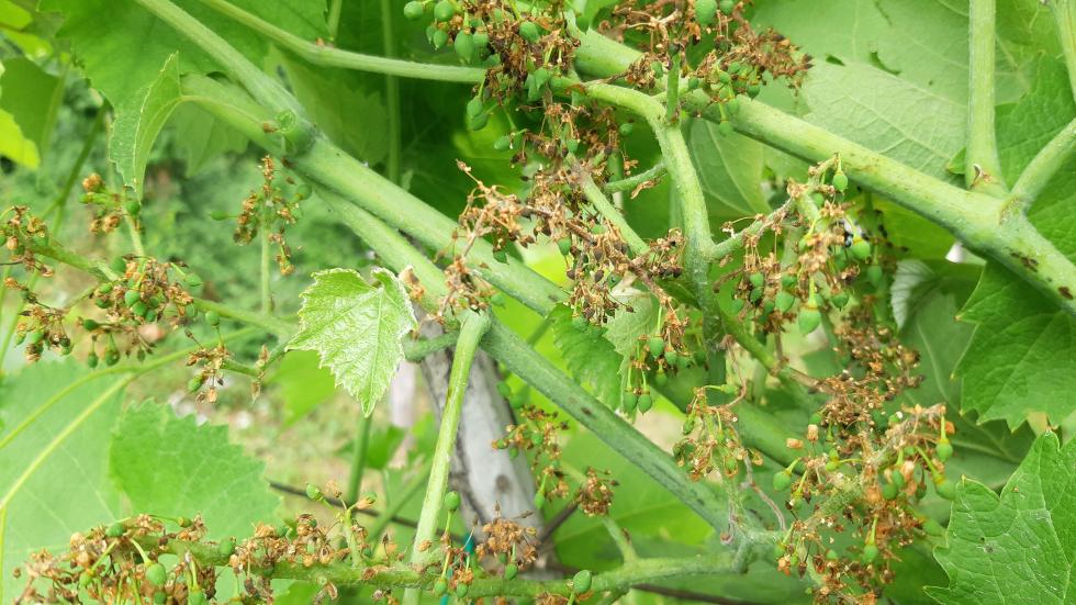 In verità è noto che la botrite può colpire anche in pre-fioritura con conseguenti disseccamenti (dopo può infettare ma di massima rimane latente), tuttavia è anche vero che questo fungo abbisogna di substrato acquoso per svilupparsi e perciò usualmente si manifesta quando gli acini maturano. Dunque direi sia il caso di accertare che il disseccamento attuale, cioè come dici dopo fioritura e a 15 gg. dalla formazione dei grappolini, sia da attribuire alla botrite.