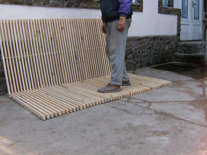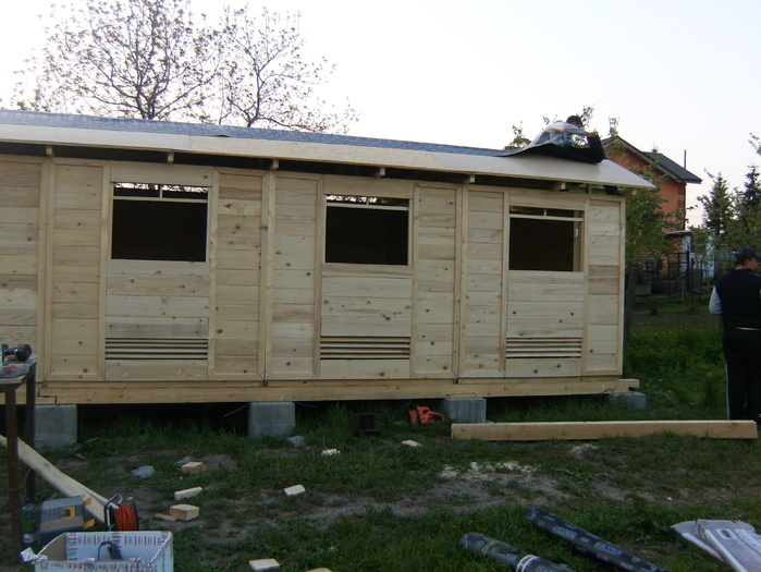 Ho scartato l'O.S.B. in quanto nel tempo sole ed acqua lo distruggono, (ci sarebbe voluto eventualmente il multistrato marino ma il costo è alto) ho optato per tavole sottomisura di larice (non abete) dello spessore di mm.20 grezze,che ho carteggiato; travetti da 4x4 e4x3 il tutto trattato con imprebnante e catrame liquido.