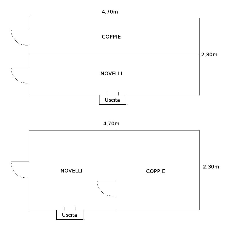 Nel secondo caso forse il più idoneo, c'è la porta principale che dà nella voliera per i novelli, che comunque avrebbero l'uscita sempre aperta, per poi avere un altra porta interna per arrivare dalle coppie, nel disegno sono circa due voliere uguali ma se mi consigliate posso fare prevalere una piuttosto che l'altra. Eventualmente studiando una maniera potrei fare una "terrazza" scoperta sempre protetta da rete nella parte delle coppie per dare più spazio, nell'altra farò una "pista di lancio" di grandezza da definire per agevolare uscita/entrata e spazio di riposo dei novelli.